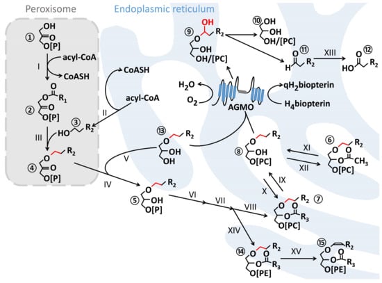 Ether lipid metabolism. Ether lipid synthesis is initiated in peroxisomes with the acylation of glycerone phosphate ① at the sn-1 position using acyl-CoA by glycerone-phosphate O-acyltransferase (I, GNPAT, EC 2.3.1.42) generating 1-acyl-glycerone-3-phosphate ②. Fatty acyl-CoA reductase (II, FAR1, EC 1.2.1.84) provides the fatty alcohol ③ for formation of the alkyl moiety by reducing acyl-CoA. Alkylglycerone phosphate synthase (III, AGPS, EC 2.5.1.26) introduces the alkyl group by exchanging the acyl side chain at sn-1 to produce 1-O-alkyl-glycerone-3-phosphate ④. The ether lipid precursor 1-O-alkyl-glycero-3-phosphate ⑤ can be either generated by acyl/alkyl-glycerone phosphate reductase (IV, EC 1.1.1.101) or from dietary alkylglycerols ⑬ by alkylglycerol kinase (V, EC 2.7.1.93). Further maturation to 1-O-alkyl-2-acyl-glycerophosphocholines ⑦ takes place at the endoplasmic reticulum in a sequential step by alkylglycerophosphate 2-O-acyltransferase (VI, EC 2.3.1.-), phosphatidate phosphatase (VII, EC 3.1.3.4) and diacylglycerol cholinephosphotransferase (VIII, EC 2.7.8.2). Alternatively, after reaction VII, ethanolamine-phosphotransferase (XIV, EC 2.7.8.1) attaches an ethanolamine—instead of the choline transferred by VIII—yielding plasmanylethanolamine ⑭, the substrate for plasmanylethanolamine desaturase (XV, EC 1.14.19.77), which is the enzyme that introduces the characteristic vinyl ether bond of plasmalogens ⑮. Alkylglycerol monooxygenase (AGMO) is located in the endoplasmic reticulum and is only able to cleave the ether bond (red) at the sn-1 of free alkylglycerols ⑬ or lyso-alkylglycerophospholipids ⑧ (here shown as cholines but also ethanolamines are accepted, however not the phosphatidic acid [6]) by using molecular oxygen and tetrahydrobiopterin (H4biopterin) as an essential co-factor. Lyso-alkylglycerophosphocholine ⑧ can be either generated from 1-O-alkyl-2-acyl-glycerophosphocholine ⑦ by phospholipase A2 (IX, EC 3.1.1.4) or from platelet-activating factor (⑥, PAF) by 1-O-alkyl-2-acetyl-glycerophosphocholine esterase (XI, EC 3.1.1.47). Both steps in lyso-alkylglycerophosphocholine ⑧ formation are reversible and use either 1-alkylglycerophosphocholine O-acyltransferase (X, EC 2.3.1.63) or 1-alkylglycerophosphocholine O-acetyltransferase (XII, EC 2.3.1.67). The AGMO enzymatic reaction creates a hemiacetal ⑨ that rearranges to the glycerol derivative ⑩ and a toxic fatty aldehyde ⑪ that is converted to the corresponding fatty acid ⑫ by fatty aldehyde dehydrogenase (XIII, FALDH, EC 1.2.1.48). R = carbon side chain; R1 = mostly 15 or 17 atoms (attached with an acyl-bond); R2 comprises 14 or 16 atoms (attached with an alkyl-bond); R3 contains at least 15 atoms with one or several double bonds (attached with an acyl-bond).