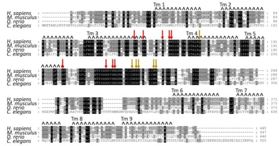Sequence alignment of Homo sapiens, Mus musculus, Danio rerio, and Caenorhabditis elegans Agmo and AGMO topology. Red arrows indicate the nine conserved histidines at positions 132, 136, 145, 148, 149, 201, 221, 224, and 225 of the human AGMO, which shape the catalytic centre. Beige arrows show six additional residues that are all essential for AGMO activity and conserved across all species (Q162, D233, N235, Y236, W243 and D244 in the human AGMO sequence). The nine transmembrane domains (Tm) are marked with staggered lines (Tm 1, 40–61; Tm 2, 70–104; Tm 3, 111–137; Tm 4, 157–179; Tm 5, 183–201; Tm 6, 334–354; Tm 7, 363–383; Tm 8, 390–409; and Tm 9, 413–433 of the human AGMO sequence). Accession numbers for all species are as follows: NP_001004320.1 (H. sapiens), NP_848882.2 (M. musculus), NP_998048.2 (D. rerio), and NP_499664.2 (C. elegans). Program alignment of protein sequences was done by ClustalW incorporated into the MEGA-X package using default parameters and visualised by Genedoc (shading of similarity groups disabled).