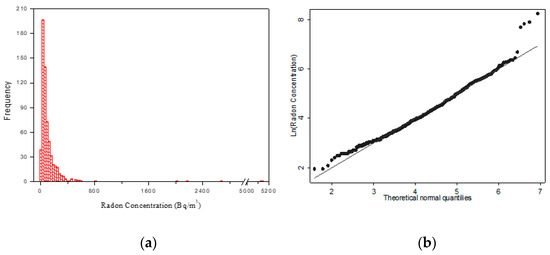 (a) Frequency distribution of indoor radon concentrations in workplaces of the Public Healthcare Company “Napoli 3”. (b) Q-norm plot of natural log-transformed radon concentration.