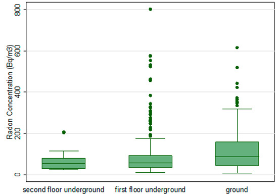 The radon concentration varied with the floor where it was measured. In this survey, of all the monitored rooms, 43% were placed on the ground/underground floor, while 57% were placed on the first and second floor underground. The t-Student test on the log-transformed data presents a statistically significant dependence from the floor (p < 0.001; Figure 2). Here, it seems that the radon concentration increases with the floor, where the radon concentration in the underground is higher than those measured in the first and second floor underground. It is well known that the concentration of radon decreases as the floor increases, but we do not have an explanation to justify this different trend of radon concentration observed. In this study, no information on the characteristics of constructions, such as age, building material, and presence of forced ventilation affecting the radon concentration, that could explain this trend, were collected. However, our finding agrees with Ruano-Ravina et al. [21] that reported in their study an increase of radon concentration with height.