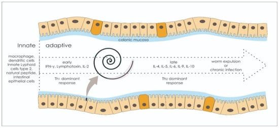Classical findings associated with immune activation in Trichuris sp. infection have delineated innate and adaptive immune systems as different processes, but recent studies have shown otherwise. The interaction between the two parts of the immune response is responsible for the successful fate of parasite eradication, as it is shown in Figure 1. IL4, IL5, and IL-13 authenticate the activation of Th2 immune response, and these proinflammatory cytokines surge prior to Th2 activation. Intestinal epithelial cells and innate immune cells can upregulate Th2 cytokines via thymic stromal lymphopoietin (TSLP), IL-25, and IL-33 secretion, which are potent inducers for Th2 cytokine expression [53,54,55,56]. Therefore, the innate cellular component could also determine the reactivity and the quality of adaptive immune responses, which could result in a failure during antigenic recognition or cellular induction that consequently reverberates to the priming and proliferation of the adaptive immune system.