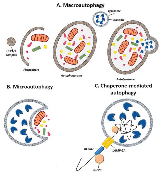 Schematic representation of the different types of autophagy. (A) Macro-autophagy: the material to be degraded is enclosed in a double-membraned cytosolic vesicle called the autophagosome. (B) Micro-autophagy: cytosol components are enclosed by lysosomes through membrane invaginations. (C) Chaperone-mediated autophagy: proteins are detected by the lysosome membrane through a chaperone called hsc70. This complex binds with lysosome-associated membrane protein 2 (LAMP-2A) and is introduced into the lysosome. (Created in part with smart.servier.com, accessed date 20 February 2021).