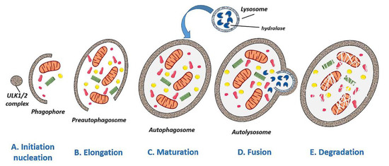 Autophagy can be divided into several phases: initiation/nucleation, elongation, maturation, fusion, and degradation. A nutrient deficiency induces the initiation or nucleation of autophagy and with it the formation of an insulating membrane that envelops damaged proteins and organelles (Figure 2A). During elongation, the double membrane of the phagophore extends and eventually closes around the contents to be degraded (Figure 2B), becoming a mature autophagosome (Figure 2C). Finally, the mature autophagosome will fuse with a lysosome to form an autolysosome (Figure 2D) and degrade its contents by proteases and lipases [9] (Figure 2E).