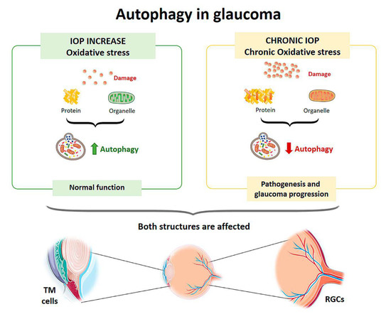 Oxidative stress plays a crucial role in the development of glaucoma by damaging the cells of the trabecular meshwork (TM), which are responsible for regulating the outflow of aqueous humor and maintaining intraocular pressure (IOP) [50]. Therefore, as an individual ages, oxidative damage accumulates, contributing to cell death by apoptosis and the development of glaucoma [51]. To protect themselves from constant oxidative stress and maintain intracellular homeostasis, TM cells activate autophagy to eliminate damaged proteins and organelles. Autophagic activity begins to saturate during the lifetime of an individual, since non-degradable materials accumulate in the lysosome compartment, which consequently causes a decrease in lysosomal activity. This decrease in autophagy leads to progressive dysfunction of TM cells and may contribute to the development of a glaucomatous pathology [52,53,54,55]. Elevated IOP can induce autophagy independently of mTOR to maintain cellular homeostasis in TM cells and cope with the mechanical forces by which they are affected. Porter et al. (2014) [53] conducted an in vitro experiment with pig eyes in which they applied a normal physiological pressure (8 mmHg) to some eyes (control eyes) and a high pressure to others (30 mmHg). Compared with controls, eyes subjected to high pressure showed increased levels of LC3-II (Microtubule-associated protein-1 light chain 3-Type II), a membrane component that is converted from LC3-I (Type I) to initiate autophagosome formation and elongation. In addition, ultrastructural analysis showed the presence of autophagosomes and autolysosomes in TM cells in those eyes subjected to high pressure, a result that was not observed in control eyes.