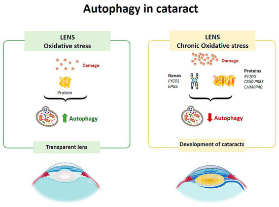 Scheme of the main autophagy changes related to cataract. (Created in part with smart.servier.com, accessed date 20 February 2021).