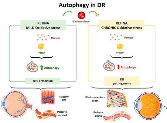 The loss of pericytes characteristic of DR leads to increased capillary permeability. Studies on the effect of autophagy performed in a mouse model of diabetes and hypercholesterolemia [89] showed that when low-density lipoproteins (LDL) leaving the vessels accumulate, several cycles of cellular damage are triggered. LDLs were found to cause endoplasmic reticulum stress, oxidative stress, and mitochondrial dysfunction, and these effects induced apoptosis in RPE cells. Autophagy plays a dual role on human retinal capillary pericytes. Thus, autophagy stimulates pericyte survival under mild stress, but if the stress is chronic, excessive autophagic activity results in pericyte necrosis [89] (Figure 5).