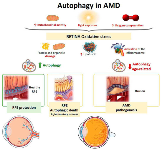 Scheme of the main autophagy changes related to age related macular degeneration (AMD). RPE: retinal pigment epithelium. (Created in part with smart.servier.com, accessed date 20 February 2021).