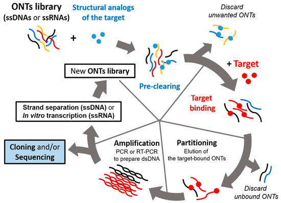Schematic representation of a systematic evolution of ligands by exponential enrichment (SELEX) procedure. The iterative in vitro selection procedure known as SELEX is used to obtain oligonucleotide ligands that bind to their target with high affinity and specificity. SELEX starts with oligonucleotide (ONT) library consisting of single-stranded DNA or RNA molecules (ssDNAs or ssRNAs). An initial pool of 1014–1015 random oligonucleotide (ONT) strands are subjected to binding with the target. Unbound ONTs are discarded, and RT-PCR or PCR is performed to amplify the target-bound ONTs. This selection process is repeated 4–20 times depending on its particular case using amplified ONTs as a new pool, which should be enriched with target-specific binders. Negative selection (preclearing) can be included in either RNA or DNA SELEX protocols, which is achieved by passing the nucleic acid pool over a supporting matrix in the absence of the target. This step aims at eliminating the oligonucleotides that bind the matrix in a target-independent manner.