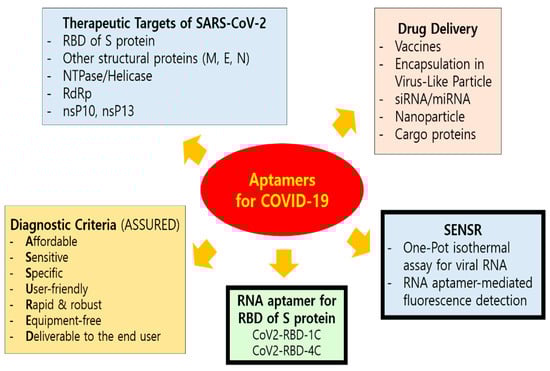 Current efforts of aptamer application for COVID-19. Aptamers can be engineered for the development of effective and affordable diagnostics, therapeutics, and prophylactic vaccines for SARS-CoV-2. Rapid and accurate detection methods, as well as smart vaccine and drug designs with SARS-CoV-2 targeting capabilities, are critically needed. The ASSURED (affordable, sensitive, specific, user-friendly, rapid and robust, equipment-free, and deliverable to the end user) diagnostic criteria is recommended by WHO. The mode of entry for SARS-CoV-2 into host cells occurs through clathrin-mediated endocytosis which depends on the binding interaction between the receptor-binding domain (RBD, Arg319-Phe541) at the C-terminus of spike proteins (S) of SARS-CoV-2 and the host cellular receptors, ACE2, along with S proteins priming by host cell transmembrane serine protease 2 (TMPRSS2). Coronaviruses have four structural proteins, i.e., spike (S), envelope (E), membrane (M) and nucleocapsid (N) that facilitate interactions with the host cell and activities within the host after internalization [108]. On the basis of the sequence similarity between SARS-CoV and SARS-CoV-2, modifications in sequence and structure of SARS-CoV aptamers may produce specific aptamers for SARS-CoV-2 proteins, including N [118].