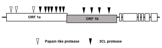 - Herold, J.; Gorbalenya, A.E.; Thiel, V.; Schelle, B.; Siddell, S.G. Proteolytic Processing at the Amino Terminus of Human Coronavirus 229E Gene 1-Encoded Polyproteins: Identification of a Papain-Like Proteinase and Its Substrate. J. Virol. 1998, 72, 910–918. [Google Scholar] [CrossRef] [PubMed]