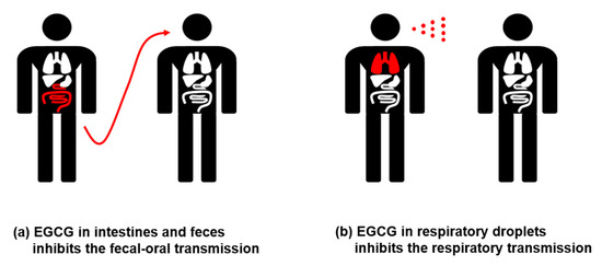 Since SARS-CoV-2 is detected in both the respiratory and gastrointestinal tracts, the distribution of EGCG in the lung, intestine, and colon is summarized in Table 3. EGCG can be administered intravenously via an injection or orally. Although intravenous injection of EGCG can increase the concentration of EGCG in the lungs, oral administration of EGCG results in a relatively low concentration of EGCG in the lungs [65]. The maximum observed concentration of EGCG in the lungs was less than 2 μg/g [65]. However, the distribution of EGCG in the small intestine and colon was higher than the IC50 for 3CL protease inhibition [65,66]. In particular, oral administration of EGCG resulted in higher levels of EGCG in the intestine and colon [65,66]. Since a small proportion of EGCG is absorbed in the intestine, most of the EGCG localizes in the feces, and the concentration of EGCG in feces is even higher than that in tissues. Therefore, we speculate that EGCG can inhibit coronavirus replication in enteric sites and patient feces, and fecal-oral transmission will be prevented by excessive concentrations of EGCG at these sites (Figure 3). In addition, the accumulation of EGCG through its repeated consumption may enhance the distribution of EGCG in other tissues.