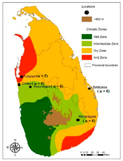 A map of Sri Lanka showing sampling sites: Puttalam, Chilaw, Kurunegala, Batticaloa and Monaragala [12].