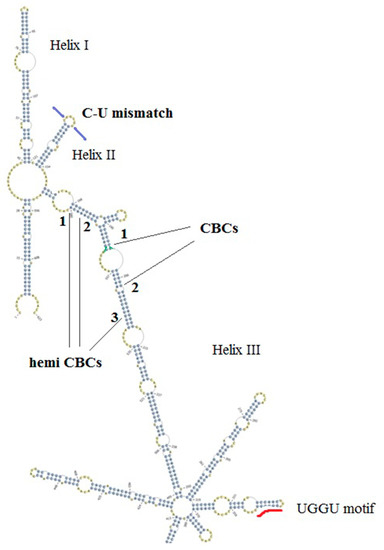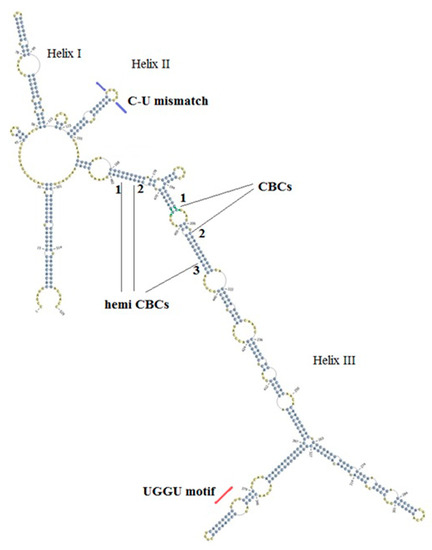 Three helix ITS2 secondary structure representing the 480 bp sized ITS2 sequences in the study. C-U mismatch is shown in helix II and a UGGU motif included in the distal part of the helix III. Two compensatory base changes and the three hemi compensatory base changes are shown in numbers.