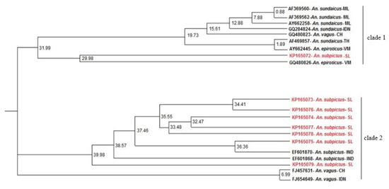 Phylogenetic analysis was performed for the generated ITS2 sequences (KP165072-KP165079) and NCBI-retrieved ITS2 sequences. However, for ITS2, selection of GenBank sequences for phylogeny construction was limited depending on the availability of full ITS2 length. Anopheles annularis was chosen to be the outgroup due to its phylogenetic distance from An. subpictus. Best-suited DNA substitution model was determined as the general time reversible model (GTR), using the programme jModelTest 0.1.1 [54]. ITS2 phylogeny was constructed by Maximum Likelihood (ML) method using MEGA-X with 1000 bootstrap replicates [53]. The estimated bootstrap values were reported as ML bootstrap percentages.