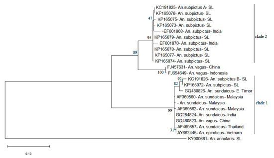 Maximum likelihood phylogenetic tree for study generated ITS2 sequences constructed using MEGA-X for 1000 bootstrap replicates. (Numbers at the nodes indicate bootstrap values). Anopheles annularis sequence (KY000681) served as the outgroup. Sequences retrieved from NCBI GenBank: AF369560, AF369562, AY662258—Anopheles sundaicus from Malaysia, GQ284824—An. sundaicus from Indonesia, GQ480823, FJ457631—Anopheles vagus from China, AF469857—An. sundaicus from Thailand, AY662445—Anopheles epiroticus from Vietnam, GQ480826—An. sundaicus from East Timor, EF601870, EF601868—Anopheles subpictus from India, FJ654649—An. vagus from Indonesia and KC191825, and KC191826—An. subpictus A and B from Sri Lanka were included in the analysis.