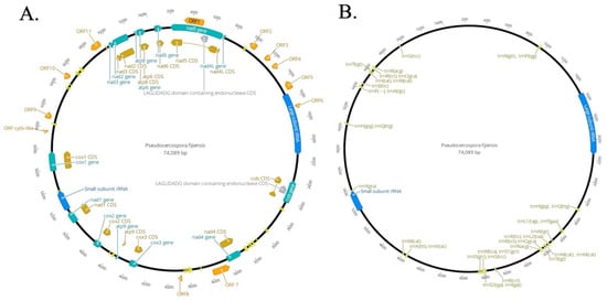 Circular map of the mitogenome of Pseudocercospora fijiensis. Genes are visualized by arrows, which are presented in a clockwise direction (forward). (A) Annotated introns, hypothetical Open Reading Frames (ORFs), group I mobile introns (Homing Endonuclease Genes (HEGs)) and genic regions; clusters of tRNA and rRNA are also indicated here. (B) Annotated tRNA and rRNA regions. Green color arrows: protein-coding genes; yellow color arrows: Coding regions CDS and introns; orange arrows: hypothetical ORFs; blue arrows: genes of large and small ribosomal subunits; bright yellow arrows: tRNAs genes; grey arrow: HEGs. Circular mitogenomes were generated by using the Geneious Primer [43].