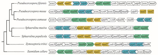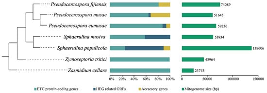 The mitochondrial phylogeny of selected species of Mycosphaerellaceae confirms evolutionary relationships found in nuclear phylogenies (((Sphaerulina musiva + Sphaerulina populicola) + (P. fijiensis + (P. eumusae + P. musae)) Zymoseptoria tritici) Zasmidium cellare) [10,12] (Figure 3). We used this phylogeny to compare mitogenomes of Pseudocercospora fijiensis, P. eumusae, P. musae, Sphaerulina populicola, and S. musiva, and previously published mitogenomes of Zymoseptoria tritici and Zasmidium cellare. They showed a GC content of between 27% and 32% and a variability in genome size from 23,743 bp in “cellar mold” Zasmidium cellare to 136,606 bp in poplar pathogen Sphaerulina populicola (Table 2, Figure 3 and Figure S2).