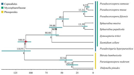 Mycosphaerellaceae Bayesian phylogeny and divergence time estimation. Mycosphaerellaceae Bayesian phylogeny with posterior probabilities in each branch and divergence time estimates calculated using fossil calibrations in BEAST2. Red star represents the fossil calibration placement.