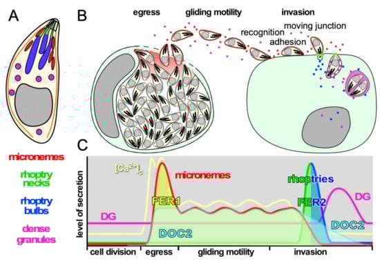 Schematic representation of the function and timing of secretion events in the T. gondii lytic cycle. (A). Schematic representation of T. gondii and its three secretory organelles, serving as legend for the other panels. (B). Schematic representation of secretion events throughout the lytic cycle. (C). Schematic representation of the levels of secretion of each organelle and the levels of intracellular calcium [Ca2+]c corresponding with the secretion events throughout the lytic cycle. Timeline on the X-axis corresponds with the events in panel B. Note that the invasion process completes in less than a minute and is shown in a stretched-out time window. The two spikes in [Ca2+]c at the time of egress correspond with the release of intracellular stores followed by the influx of extracellular Ca2+, while the [Ca2+]c oscillates during gliding in concert with bursts of motility [4]. The activity of DOC2 and FER1 and FER2 is also indicated.