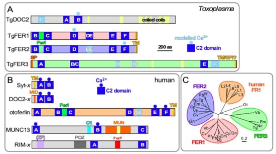 The ferlin family comprises a distinct family of DOC2 proteins absent from neurons that facilitate secretory processes in other cell types. Ferlins are defined by a C-terminal TM domain and 5–7 C2 domains, typically organized in three DOC2 domains (Figure 2). Vertebrate ferlins function in the secretory, endocytic and lysosomal pathways with structural and functional importance in health and disease [38]. Secretion of synaptic vesicles from the inner ear cells upon mechanical stimulation by sound, only a single Ca2+-sensor, otoferlin, is required for exocytosis, at the site of secretion, thereby deviating significantly from the standard model of Ca2+-dependent exocytosis established in neurons [39,40,41]. Humans encode six ferlins that cluster closely together compared to the three different apicomplexan ferlins (Figure 2C). This suggests that the apicomplexan diversity represents unique clades that originated independently of the mammalian ferlins, which appear to have radiated out of a single ancestral mammalian ferlin.