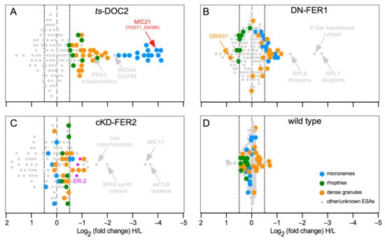 SILAC data for T. gondii DOC2 and Ferlin mutants. (A). ts-DOC2 is a recreated temperature sensitive allele of DOC2 conditionally treated at 35 °C and 40 °C [43,47]; (B). DN-FER1 is a DD-Myc conditional overexpression allele induced with 1 μM Shield-1 [47]; (C). cKD-FER2 is tetracycline regulated promoter replacement induced with 1 μM ATc [59]; (D). the wild type control consisted of RHΔKu80 parasites treated at 35 °C and 40 °C. All inductions were performed for 48 hrs on intracellularly replicating parasites. For ESA collection, parasites were mechanically lysed from the host cell, and stimulated with 2% ethanol for 15 min. Parasites grown under permissive conditions were grown in light-isotope (L) labeled amino acids; parasites at restrictive conditions in heavy-isotope (H) labeled amino acids. Equal amounts of ESA collected under permissive and restrictive conditions were mixed and subjected to mass spectrometry. Averages of two biological repeats are shown, except for cKD-FER2 which was a single experiment. Marked in pink, the cKD-FER2 experiment is the only one in which some ER proteins (ER-2 pool defined in [117]) were detected (TGGT1_229480: putative calcium binding protein precursor; TGGT1_221210: cyclophilin; TGGT1_211680; protein disulfide isomerase). Dotted lines mark the −0.5 and +0.5 Log2 arbitrary cut-offs for decreased or increased significant changes, respectively, in excretion/secretion above background.