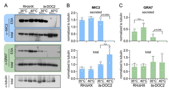 Dense granule secretion is TgDOC2 dependent. (A). Representative Western blots of ts-DOC2 secretion assays as performed for the ESA-SILAC experiment. “total” represents the pellet of the ESA assay. Antiserum against α-tubulin was used as loading control. Relative to the first lane for each condition, only half the protein amount was loaded in the second lane. (B). Quantification of secreted and total MIC2 normalized against α-tubulin shows that MIC2 expression is 3-fold upregulated in ts-DOC2 at the restrictive condition (40 °C), yet none is secreted. (C). Quantification of secreted and total GRA7 normalized against α-tubulin shows that GRA7 is not upregulated, but its stimulated secretion is dependent on DOC2. All blots used for quantification are provided in Supplementary Figure S2 and the quantification data in Supplementary Table S2. Statistics was performed with a two-tailed, two sample equal variance Student’s t-test; n.s.: non significant.