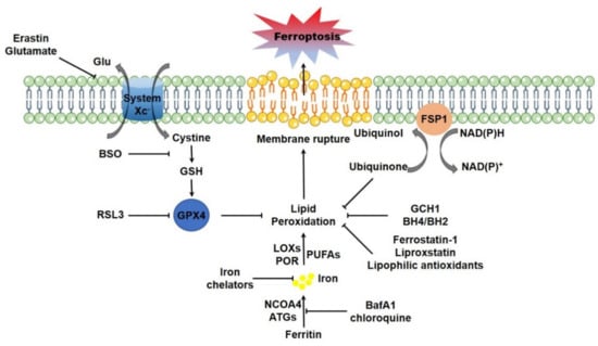 The main regulatory circuit of ferroptosis. System XC- mediated cystine uptake-GSH synthesis-GPX4, FSP1-CoQ-NADPH and GCH1-BH4/BH2 are major pathways for suppressing lipid peroxidation. Erastin, BSO and RSL3 are typically targeting to system XC-, GSH synthesis, and GPX4, respectively, to disrupt these endogenous lipophilic antioxidant systems and elevate lipid peroxidation. The LOXs and POR could enzymatically catalyze the formation of lipid peroxides, while cellular free iron catalyzes lipid peroxidation via Fenton rection or via the LOXs or POR. Autophagic ferritin degradation (ferritinophagy) could motivate cellular iron and facilitate lipid peroxidation. Iron chelators, as well as the autophagy inhibitors including BafA1 and chloroquine, could suppress lipid peroxidation and counteract ferroptosis by decreasing cellular free iron. Furthermore, the lipophilic antioxidants could directly trap lipophilic radical to halt the propagation of lipid peroxidation and suppress ferroptosis.The lethal outburst of lipid peroxides ultimately drives ferroptosis. Abbreviations: ATGs, autophagy genes; BafA1, bafilomycin A1; BH4/BH2, tetrahydrobiopterin/dihydrobiopterin; BSO, buthionine sulfoximine; FSP1, ferroptosis suppressor protein 1; GCH1, GTP cyclohydrolase 1; Glu: glutamate; GPX4, glutathione peroxidase 4; GSH, glutathione; LOXs, lipoxygenases; NADPH, β-nicotinamide adenine dinucleotide 2′-phosphate, reduced; NCOA4, nuclear receptor coactivator 4; POR, cytochrome P450 oxidoreductase; PUFAs, polyunsaturated fatty acids.