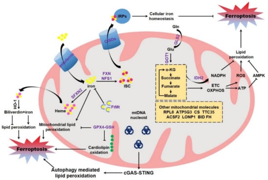 Trace elemental iron is one of the essential nutrients for cell growth. However, iron overload, one of the most substantial causes and typical hallmarks of ferroptosis, facilitates mitochondrial damage at distinct levels [98,99]. Iron overload leads to the abnormal mitochondrial morphology, resulting in a fragmented architecture in several types of cultured mammalian cells [100,101]. Excess iron supplementation also compromises mitochondrial functionalities by restricting mitochondrial oxidative phosphorylation and antioxidant response [102]. The mtDNA is vulnerable to iron deposition. It was reported that double strand breaks of mtDNA are observed in iron-exposed mitochondria. Iron overload also leads to progressive loss of intact mtDNA, as well as reduced mtDNA transcription and decreased expression of respiratory chain subunits encoded by mitochondrial genome [103,104,105,106]. Conversely, preserving mitochondrial architecture and functionalities by utilizing distinct approaches was evidenced to protect cells from iron toxicity in multiple models. Specifically, inhibition of DRP1 mediated mitochondrial fragmentation prevents ferric ammonium citrate-induced neuronal cell loss [107]. Injection of the mitochondrially targeting antioxidant mito-TEMPOL [108] could alleviate hepatotoxicity and lower hepatocytic death induced by excess dietary iron [109]. These studies thus enlightened a causal role of mitochondrial dysfunction in iron overload mediated cell damage, which is now considered to highly relate to ferroptosis.