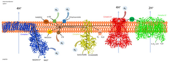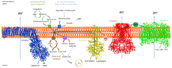 The connection among these enzyme complexes is ensured by two mobile transporters of electrons, i.e., Coenzyme Q (CoQ, ubiquinone) and cytochrome c (cyt. c) [14]. The former is a lipophilic quinone incorporated in the lipid bilayer of the mtIM, while cyt. c is a hydrophilic hemoprotein facing the mitochondrial IMS, in contact with the external surface of the mtIM. The membrane-ETS operates through the following sequence of the respiratory enzyme complexes: (Equations (1) and (2))