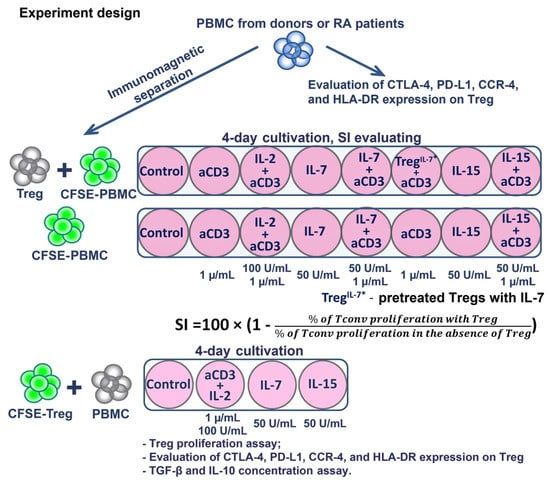 Peripheral blood mononuclear cells (PBMCs) were isolated using Ficoll density gradient centrifugation. Treg cells were purified by immunomagnetic separation according to the CD3+CD4+CD25+CD127low phenotype using a Miltenyi Biotec MACS Treg Isolation Kit, according to the manufacturer’s protocol (Teterow, Germany). The purity of the magnetic separation was 94.2 ± 3% (mean ± SD), and FoxP3 expression was checked by flow cytometry and was 83 ± 3.5% (mean ± SD), with no difference between the healthy donors and RA patients. The functional activity of the Tregs was evaluated by the inhibition of CD4+ and CD8+ lymphocyte proliferation with a Treg/PBMC autologous co-culture ratio of 1:1 (i.e., 30,000 Tregs and 30,000 PBMCs). Before cultivation, PBMCs depleted by Tregs were stained with CFSE (Invitrogen, Waltham, MA, USA) to assess proliferation. The cells were cultivated over 4 days in 96-well U-bottom plates with RPMI 1640 medium supplemented with 10% FCS and antibiotics, in a total volume of 200 µL. The following concentrations of cytokines were applied: anti-CD3 (Sorbent, Moscow, Russia), 1 µg/mL; IL-7 (MyBiosource, San Diego, CA, USA), 50 ng/mL; IL-15 (MyBiosource, San Diego, CA, USA), 50 ng/mL; IL-2 (NPK BIOTECH, St. Petersburg, Russia), 100 IU/mL. We used the following stimulation conditions: anti-CD3, IL-7, IL-15, anti-CD3 + IL-2, anti-CD3 + IL-7, and anti-CD3 + IL-15. To directly measure HP cytokines’ effects, Tregs were previously incubated with IL-7 (50 ng/mL) or with IL-15 (50 ng/mL) over 2 h, washed twice, and then cultivated with PBMCs stimulated by anti-CD3. CFSE-stained PBMCs were cultivated under the same conditions without Treg cells (60,000 per well) to calculate the suppression index (SI). Cells were also cultivated without any stimulation applied, as the cell proliferation control. The Treg suppression index (SI) was calculated for CD4+ and CD8+ cells using the following formula []: