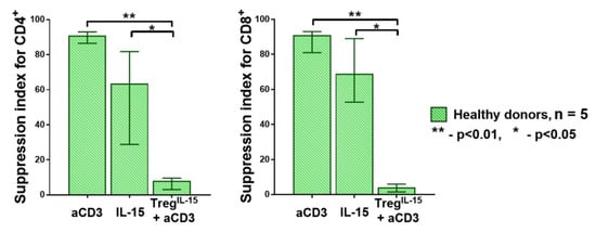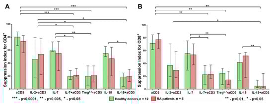 Tregs are the main cells providing tolerance to self-antigens through a wide range of mechanisms. It has been shown that Tregs are able to inhibit T cell proliferation and cytokine production, thus preventing autoimmunity []. However, the role of these cells in the suppression of self-reactive T cell clones during homeostatic proliferation is understudied. It is assumed that a decrease in Treg quantity and their impaired function may lead to the development of autoimmune diseases []. At the same time, the results from existing research on Treg cell function in patients with rheumatoid arthritis (RA) remain controversial. While some studies demonstrate decreases in Treg numbers or suppressive activity in RA patients [,,,,], others show the preservation of their functional activity and quantity [,,,]. Nevertheless, despite the increased synovial infiltration of Tregs in RA patients [], the inflammation does not resolve, raising the question as to whether their suppressive activity is actually preserved. Thus, this study was aimed at determining the functional activity of Tregs in RA patients and investigating the influence of humoral factors of HP on Tregs in vitro. For that purpose, we investigated the capacity of Tregs to inhibit the proliferation of CD4+ and CD8+ cells stimulated by various HP humoral factors. We used IL-7 or IL-15 alone and in combination with anti-CD3 (analogs of slow and fast HP, respectively). Since the TCR signal and IL-2 are the most important factors for the maintenance of Treg function, we also stimulated proliferation with an anti-CD3 + IL-2 combination. Thus, we used the following stimulation conditions: anti-CD3 only, anti-CD3 + IL-2, IL-7 only, anti-CD3 + IL-7, IL-15 only, anti-CD3 + IL-15, Tregs pretreated with IL-7 or IL-15 stimulated by anti-CD3, and a control without stimulation.