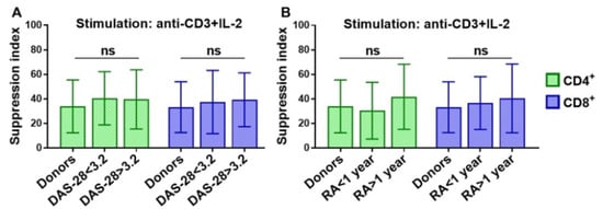In order to find out whether disease activity or duration influenced the Treg suppressive activity, we additionally enrolled thirteen patients with different illness durations and DAS-28 results (Table 2) and assessed the suppressive activity of Tregs under anti-CD3 + IL-2 stimulation (Figure 4).