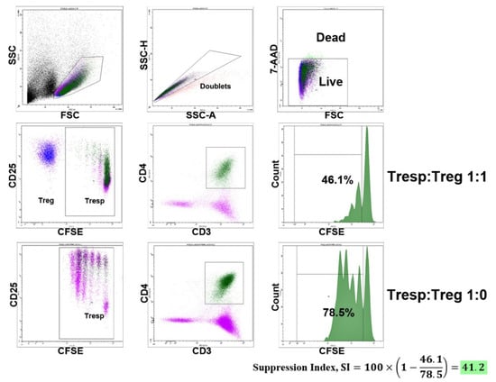Example of the gating strategy for the evaluation of Treg SI for CD4+ cells. Treg cells were isolated using magnetic separation. For the suppression assay, PBMCs labeled with CFSE and Tregs were co-cultured in 1:1 ratio in different conditions of stimulation during 4 days. CFSE-labeled PBMCs were also cultivated under the same conditions without Treg cells to calculate the suppression index (SI). 7-AAD was used to live/dead discrimination.