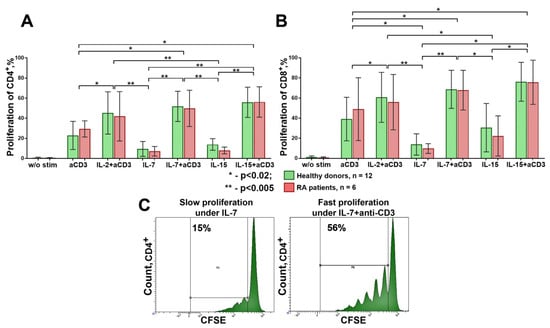 Proliferation of CD4+ (A) and CD8+ (B) cells in healthy donors (n = 12) and RA patients (n = 6); (C) example of slow and fast proliferation (for an example of one of the donors). Significantly higher proliferation of CD4+ and CD8+ cells was observed when the influence of cytokines (IL-2, IL-7, or IL-15) was accompanied by TCR stimulation with anti-CD3 antibodies. Mean ± SD. A comparison of related groups was performed using one-way analysis of variance for dependent groups (RM one-way ANOVA), and post hoc analysis was performed using Tukey’s tests. Unrelated groups were compared using unpaired Student’s t-tests. RA, rheumatoid arthritis.
