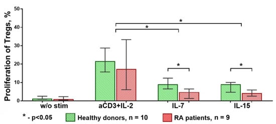 The highest Treg proliferation was observed when the cells were stimulated by anti-CD3 + IL-2, with the results being similar in the HD and RA groups. However, the proliferation of Treg cells under IL-7 or IL-15 stimulation was significantly decreased in the RA group (Figure 7).
