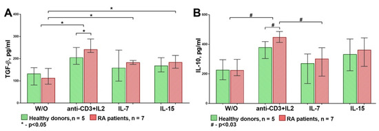 The statistical analysis revealed that the anti-CD3 + IL-2 stimulation significantly increased TGF-β and IL-10 production in both groups compared to the control levels when no stimulation was applied. In this study, IL-7 and IL-15 significantly increased TGF-β production only in the RA group. Moreover, TGF-β and IL-10 production was significantly higher in the RA patients than the healthy donors under the anti-CD3 + IL-2 stimulation.