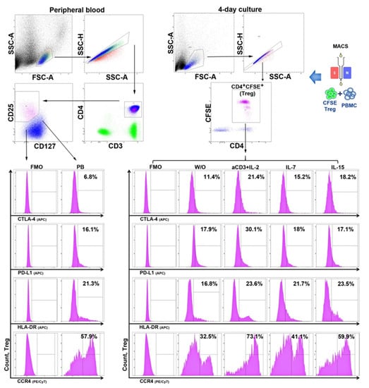 To directly measure HP cytokines’ effects, CFSE-labeled Tregs with autologous PBMCs (30,000:30,000) were also cultivated with IL-7, IL-15, and anti-CD3 + IL-2 stimulation to assess their proliferation. The supernatants were sampled on Day 3 (according to the manufacturer’s instructions) to determine the concentrations of IL-10 (Vector-Best, Novosibirsk, Russia) and TGFβ (BioLegend, San Diego, CA, USA), the main Treg-suppressing cytokines, via ELISA. The expression of CTLA-4, PD-L1, CCR4, and HLA-DR on Tregs was estimated by flow cytometry before cultivation and on Day 4 of the experiment (Figure 1).