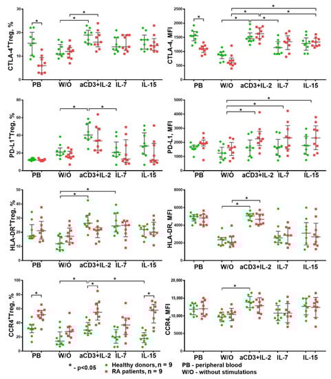 The statistical analysis revealed the following changes (Figure 10): anti-CD3 + IL-2 stimulation significantly increased the percentage of Treg cells expressing CTLA-4, PD-L1, HLA-DR, and CCR4 in the healthy donors. The expression density (MFI) of these functional molecules on the Tregs’ surfaces also increased. At the same time, HP cytokines only significantly increased the expression density of PD-L1 (MFI) on Treg cells. Similar results were also obtained for the RA patients. It should be noted that the Treg cells from the RA patients differed from the healthy donors’ by their higher CCR4+ Treg percentage, both in the peripheral blood and under the influence of anti-CD3 + IL-2 and IL-15. Thus, the only difference between the HD and RA groups was the expression of the CCR4 chemokine receptor (a receptor for the chemokines CCL22 and CCL17), which facilitates migration to sites of inflammation.