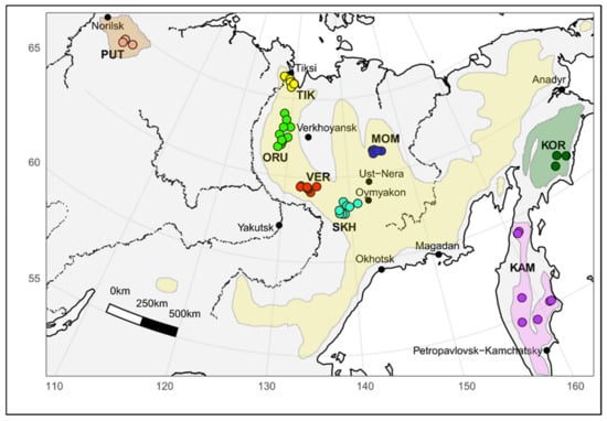 Map with sampling sites of snow sheep used in this study and the area of the species habitat. TIK = Kharaulakh Ridge–Tiksi Bay, ORU = Orulgan, VER = Central Verkhoyansk, SKH = Suntar-Khayata, MOM = Momsky, KAM = Kamchatka snow sheep, KOR = Koryak, PUT = Putorana.