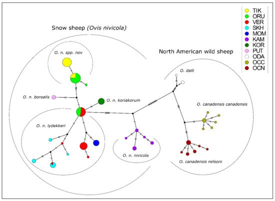 Median joining network of snow sheep (Ovis nivicola) and North American wild sheep haplotypes, based on analysis of mtDNA cytb gene polymorphism. The diameter of the circle corresponds to the number of individuals belonging to this haplotype. The number of transverse lines indicates the number of nucleotide substitutions. The black circles at the branching points of the network are hypothetical haplotypes. TIK = Kharaulakh Ridge–Tiksi Bay, ORU = Orulgan, VER = Central Verkhoyansk, SKH = Suntar-Khayata, MOM = Momsky, KAM = Kamchatka, KOR = Koryak, PUT = Putorana, ODA = Dall sheep, OCC = Rocky Mountain bighorn, OCN = desert bighorn sheep.