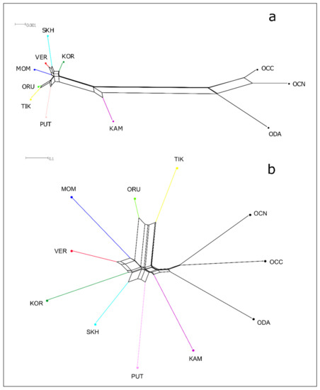 Neighbor-Net tree of snow sheep (Ovis nivicola) and North American wild sheep, based on genetic distances based on the Kimura-2-parameter model (a) and pairwise FST (b). TIK = Kharaulakh Ridge–Tiksi Bay, ORU = Orulgan, VER = Central Verkhoyansk, SKH = Suntar-Khayata, MOM = Momsky, KAM = Kamchatka, KOR = Koryak, PUT = Putorana, ODA = Dall sheep, OCC = Rocky Mountain bighorn, OCN = desert bighorn sheep.