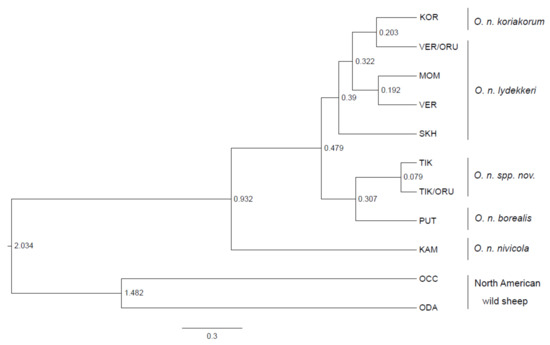 Genetic distances based on the Kimura-2-parameter model (Table 3) confirmed the most genetic distance of the Kamchatka snow sheep from the other studied groups.