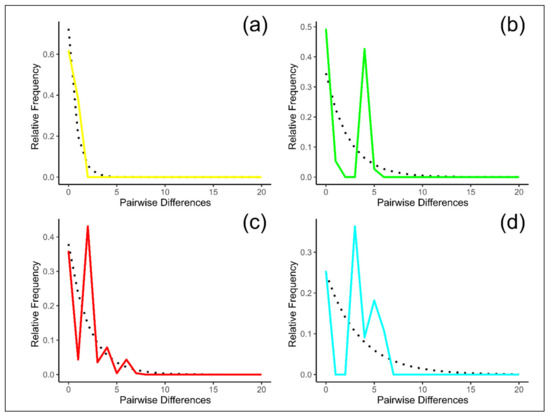 - Rogers, A.R.; Harpending, H. Population growth makes waves in the distribution of pairwise genetic differences. Mol. Biol. Evol. 1992, 9, 552–569. [Google Scholar] [CrossRef] [PubMed]