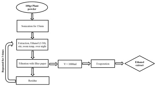 Fresh medicinal plants were cleaned and washed thoroughly with water and re-washed with distilled water. Washed fresh leaves were shade-dried, powdered mechanically, and sieved by using a mesh. For preparation of organic solvent extracts, 100 g of powdered material was mixed with 1000 mL of ethanol, sonicated for 15 min in a sonication bath (with set-up conditions of 35 °C; 40 kHz frequency and 150W ultrasonic power) [28], before extraction for overnight with stirring at room temperature. The resulting extract was removed, and the procedure was repeated two additional times on the solid residue. All extracts were filtered, pooled, and the solvent removed under reduced pressure at 40 ± 5 °C using a rotary flash evaporator. The scheme of the extraction procedure is presented in Figure 1. The obtained extract was dissolved in DMSO for further analysis and exposure on cells and zebrafish eggs.