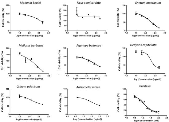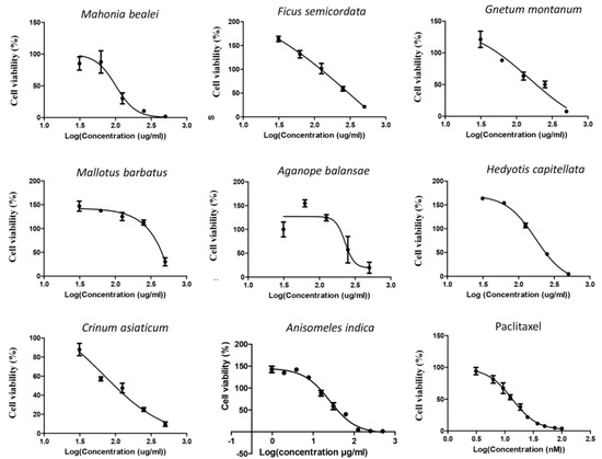 The MCF-7 cells were treated with the extracts at various concentrations of 1, 5, 10, 50, 100, 250, 500 and 1000 µg/mL. The toxicity curves of the ethanol extracts of Mahonia bealei, Ficus semicordata, Gnetum montanum, Crinum asiaticum, Mallotus barbatus, Aganope balansae, Hedyotis capitellata, Anisomeles indica and Paclitaxel were presented. The cell viability is shown as % relative to untreated control. The curves were drawn by using GraphPad prism software.