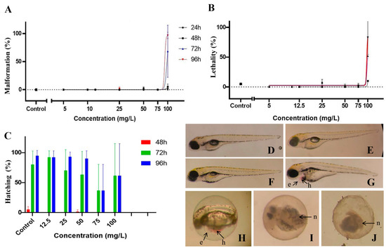 Experiments were conducted to evaluate the effect of AI-EtE on the development of zebrafish embryos at different stages. AI-EtE at various doses of 0, 5, 10, 12.5, 25, 50, 75, 100, 150, 200 and 400 (mg/L) were applied. At each time point (24, 48, 72, and 96 h post-fertilization (hpf)), the presence of developmental defects and lethality of the zebrafish embryos (larvae) were assessed (Figure 4A,B). The specific endpoint of hatching was also assessed at 48, 72 and 96 hpf (Figure 4C). At concentrations up to 75 mg/L, AI-EtE had almost no effect on the development of defects or death of zebrafish larvae with malformation of 5%, lethality of 2.5%, and hatching efficiency of 70% (Figure 4A–C). However, at 100 mg/L, a sharp increase in developmental malformations (Figure 4A) with haemovascular defects and heart/yolk sac oedema on 75% larvae at 72 hpf and 90% larvae at 92 hpf (Figure 4G,H). Similarly, at doses above 100mg/L, a sharp increase in embryo and larva death was observed at each observation time point (Figure 4B). At 150 mg/L, 200 mg/L and 400 mg/L, AI-EtE was very toxic to zebrafish embryos because of the death of all embryos at very early time (Figure 4H–J). In addition, we monitored the hatching percentage of the embryos, which normally takes place between 48 and 72 hpf, as illustrated in the control fish (Figure 4C). Treatment with AI-EtE had a negative effect on the hatching ability in a dose-dependence manner. Specifically, at 75 mg/L, AI-EtE strongly decreased the hatching percentage of zebrafish embryos to around 30% at both 72 hpf and 96 hpf (Figure 4C).