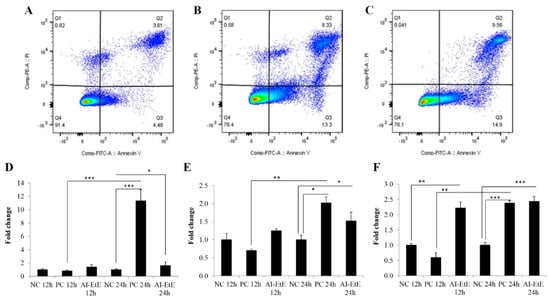 HeLa cells were treated with DMSO (negative control), AI-EtE at IC50 dose of 38.8 mg/L or paclitaxel (positive control) at IC50 dose of 13.5 ng/mL for 24 h before collecting, fixing, staining with propidium iodide (PI)/annexin V-FITC and subjecting to flow cytometry system to measure of apoptosis. Representative data sets of apoptotic pattern of HeLa cells upon DMSO treatment (A), AI-EtE treatment (B), and paclitaxel treatment (C) are presented. Transcript levels of BAX (D), CASPASE-8 (E), CASPASE-3 (F) in HeLa cells treated with AI-EtE and paclitaxel for 12 h and 24 h. *, ** and ***, significant differences with p values < 0.05, <0.01 and <0.001, respectively. TBP was used as internal control gene. NC: negative control, PC: positive control (paclitaxel).