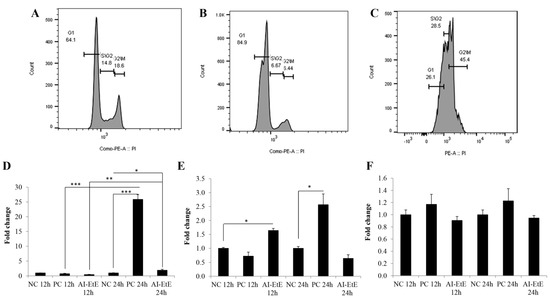 HeLa cells were treated with DMSO (negative control), AI-EtE at IC50 dose of 38.8 mg/L or paclitaxel (positive control) at IC50 dose of 13.5 ng/mL for 24 h before collecting, fixing, staining with propidium iodide and subjecting to flow cytometry system to measure of cellular DNA content. Representative data sets of cell cycle pattern of HeLa cells upon DMSO treatment (A), AI-EtE treatment (B), and paclitaxel treatment (C) were presented. Transcript levels of CDKN1A (D), CDKN2A (E) and p53 (F) in HeLa cells treated with AI-EtE and paclitaxel for 12 h and 24 h. *, ** and ***, significant differences with p values <0.05, <0.01 and <0.001, respectively. TBP was used as internal control gene. NC: negative control, PC: positive control (paclitaxel).