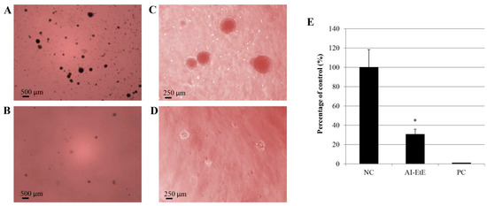 Anchorage-independent growth of HeLa cells. Colonies formed on the soft agar in case of control cells (A,C) and AI-EtE-treated cells (B,D) at magnifications of 2X (A,B) and 5X (C,D). The differences in colony formation ability on soft agar of HeLa cells are presented in a graph (E). *, significant differences with p values < 0.05.