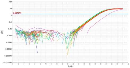 Amplification curves of hsa-miR-382-5p in 64 analyzed samples of blood plasma with indication of a threshold value, the point at which fluorescence reaches values above baseline levels.